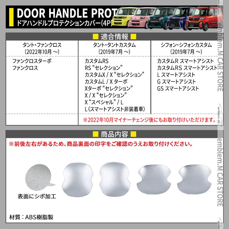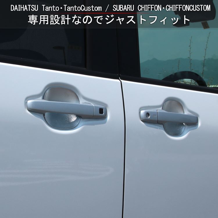商品名 ダイハツ タント・タントカスタム / スバル シフォン・シフォンカスタム LA650S/LA660S ドアハンドルプロテクションカバー 適合車種 ダイハツ タント/タントカスタム(DAIHATSU TANTO/TANTOCUSTOM) 【年式:2019年7月 〜】 ■タント■ X ターボ X ターボ “セレクション” X X “セレクション” X “スペシャル” L L(スマートアシスト非装着車) ■タントカスタム■ カスタムRS カスタムRS “セレクション” カスタムX カスタムX “セレクション” カスタムL スバル シフォン/シフォンカスタム(SUBARU CHIFFON/CHIFFONCUSTOM) 【年式:2019年7月 〜】 ■シフォン■ L スマートアシスト G スマートアシスト GS スマートアシスト ■フォンカスタム■ カスタムR スマートアシスト カスタムRS スマートアシスト ※全グレード対応 ※こちらの商品は前後左右がございますので、商品裏面に文字をご確認してから取付をお願いします。