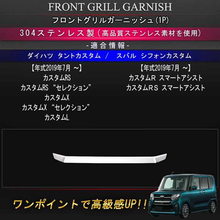 商品名 ダイハツ タントカスタム / スバル シフォンカスタム LA650S/LA660S フロントグリルガーニッシュ 適合車種 ダイハツ タントカスタム(DAIHATSU TANTOCUSTOM) 【年式:2019年7月 〜】 カスタムRS カスタムRS “セレクション” カスタムX カスタムX “セレクション” カスタムL スバル シフォンカスタム(SUBARU CHIFFONCUSTOM) 【年式:2019年7月 〜】 カスタムR スマートアシスト カスタムRS スマートアシスト こちらの商品はタントカスタム/シフォンカスタム専用ですので、タント/シフォグレードには非対応となります。